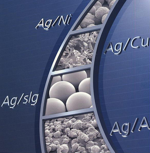 Kymera International社では、銅・アルミなど自社製の粉末だけではなく、ニッケル・ガラス・アルミナ・PMMA・カーボンなどの他社から供給を受けた粉末を核に使い、銀コート粉末を作る技術を確立させました。粒度は5μなど微粉についても対応可能です。形状は、球状・フレーク状・針状がそろっております。高価な銀粉末の代替えや、機能性フィラーとして、採用事例を頂いております。
